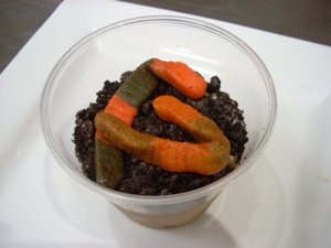 Take a dive into this cup of gummy worms guarding a red velvety sponge nestled in our decadent chocolate crunch mouse and topped with real oreo cookie chunks.
