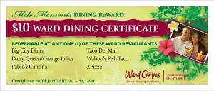 (Certificate redeemable from January 10-31, 2011 at any one of the following restaurants: Pablo's Cantina, Wahoo's Fish Taco, ZPizza, Big City Diner, Taco Del Mar and Dairy Queen / Orange Julius)