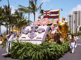 Aloha Festivals merchandise available for sale, including Aloha Festival ribbons, shirts, hats and bags