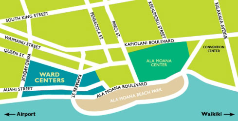 - Westbound from Waikiki: From Ala Wai Boulevard, turn left on Niu Street to connect to Ala Moana Boulevard. Turn right on Queen Street (one block past Ala Moana Shopping Center) and left on Auahi Street. Ward Centers is located on both sides of Auahi Street.
